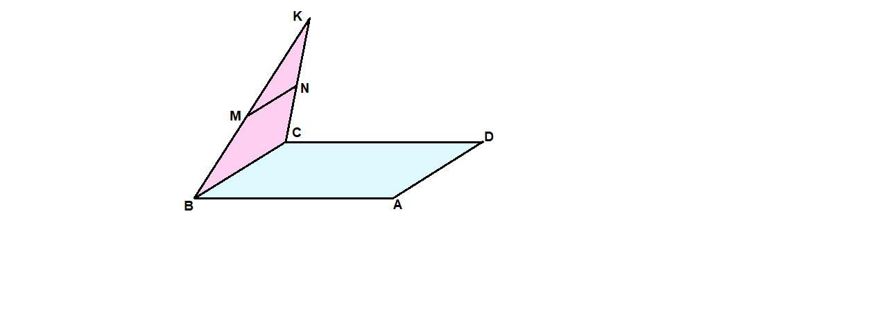 Треугольник BKC и прямоугольник ABCD не лежат в одной плоскости. Точки M и N - середины отрезков BK и KC соответственно. Докажите, что АD параллельна МN.Найти AD,если MN=4 см.