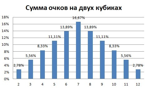 На диаграмме в приложении распределение вероятностей для всех возможных вариантов суммы очков.