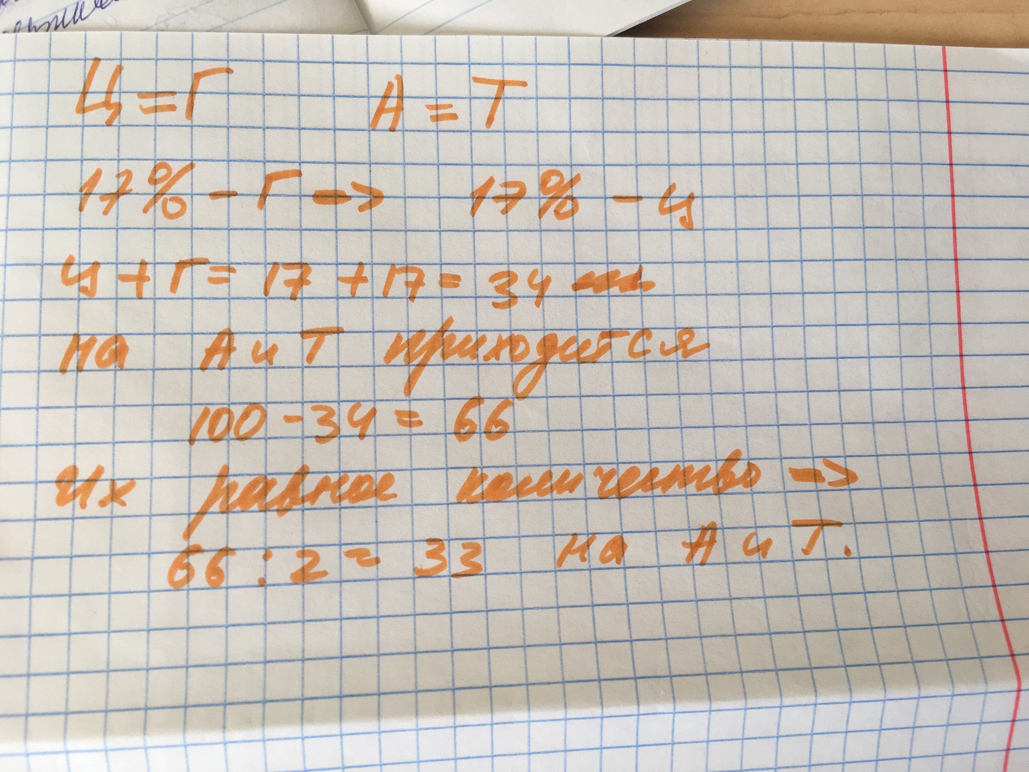 В молекуле днк гуаниновых нуклеотидов насчитывается 17% от общего числа нуклеотидов. Определите количество тиминовых и цитозиновых нуклеотидов.