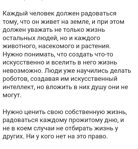 Әрбір адам жер бетінде өмір сүргеніне қуана білуі керек және тек адамдардың өміріне ғана емес, жәндіктермен өсімдіктерге де құрметпен қарауы керек. Бір затты қолдан жасап, оған өмір силай алмайтындығын түсіну керек. Адамдар қазір робот жасауды үйренді бірақ, оған жасанды тән бергенімен, жан бере алмайды. Өз өміріңді бағалай білу керек, әрбір күніңе қуана білу керек, өзгенің өмірін ешқашан жоюға болмайды. Бұған ешкімнің құқығы жоқ.