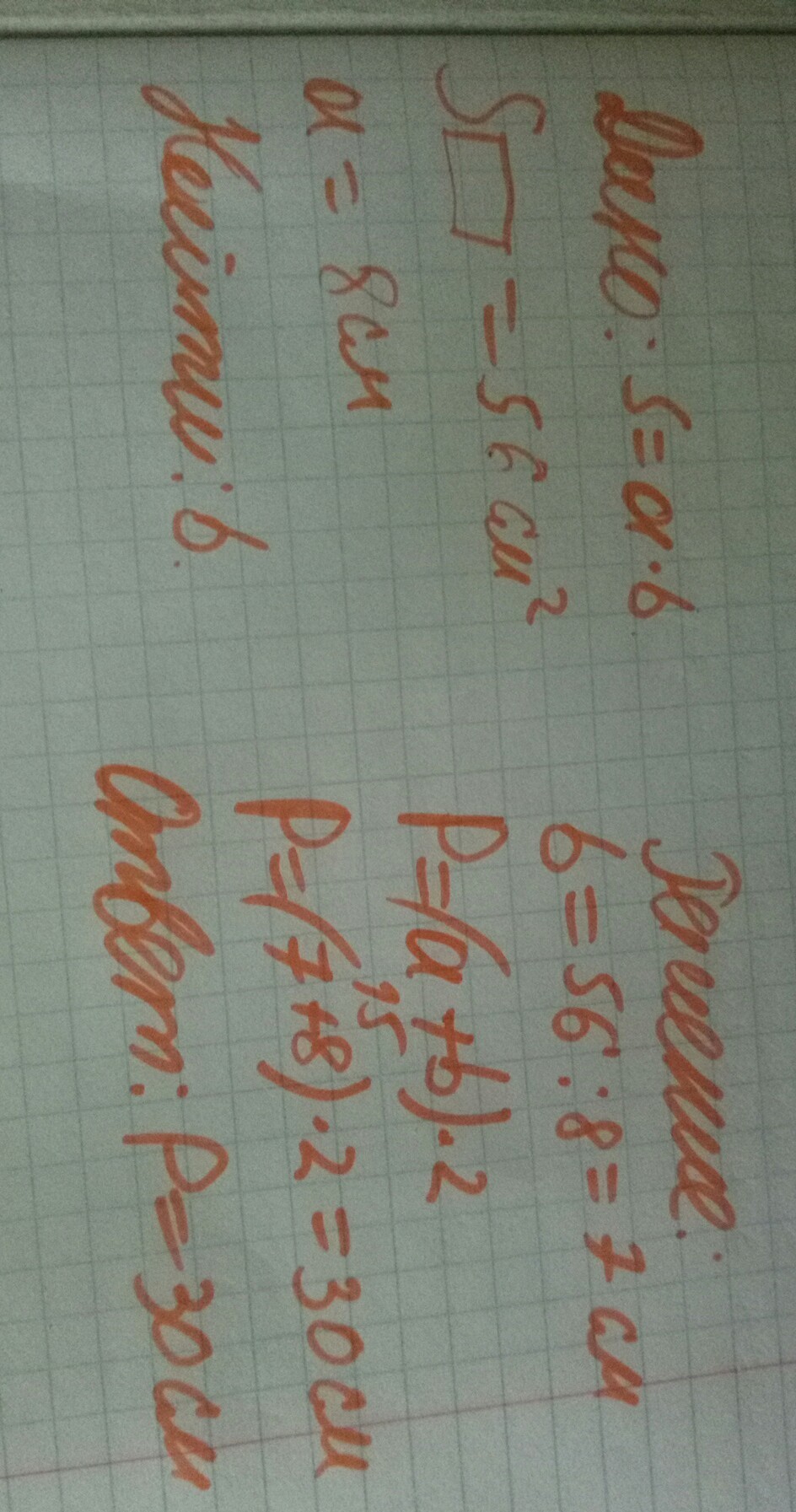 Площадь прямоугольника, одна сторона которого равна 8 см, равна 56 см². Найди его периметр. СРОЧНО РАСПИСАТЬ ЗАДАЧУ РЕШЕНИЕ И ОТВЕТЬ!!!!!!!