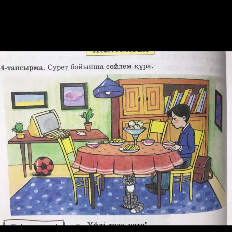 мынау қонақ бөлмесі. бұл бөлменің ортасында үстел тұр. мен осы үстелдің үстінде түскі асымды ішіп отырмын.қазір мен мектепке барамын.үстелдің астында мысық бар. оның аты Лена. ол өте ақылды мысық.үстелдің қасында кітаптарға арналған шкаф бар. оның ішінде əкемнің кітаптары бар. бөлменің бір бұрышында компьютерге арналған үстел бар. оның үстінде компьютер бар. оның астында меніңдалада ойнайтын добым тұр. қонақ бөлме маған қатты ұнайды.