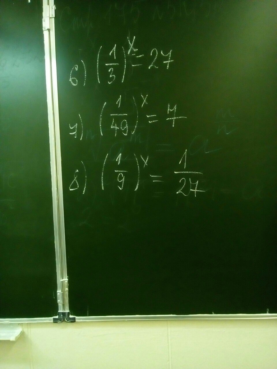 6).(3^-1)^x=3^(3); -x= 3; x=3/(-1)= -3. 7). (7^-2)^x=7^1; 7^(-2x)=7^(1); -2x=1; x= -1/2. 8). (1/3^2)^x=1/3^(3); 1/3^(2x)=1/3^(3); 2x=3; x=3/2=1,5.