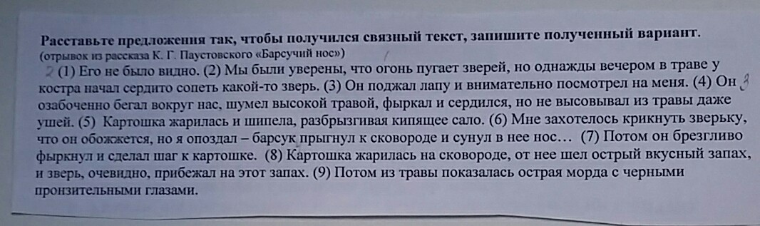 ПОМОГИТЕ надо расставить предложения в правильном порядке Паустовский "Борсучий нос"