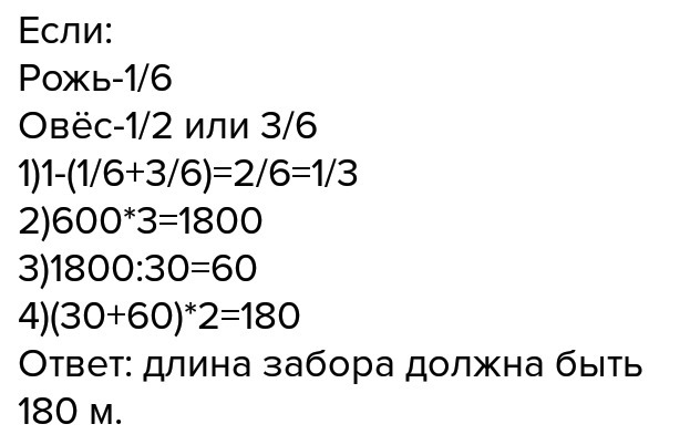 У поля прямоугольной формы одна из сторон равна 30 метров. Половина поля засеяна овсом, а другая половина - пшеницей и рожью. Пшеница занимает 600 кв.м. , а рожь - одну шестую часть всего поля. Какой длины должен быть забор, огораживающий всё поле?
