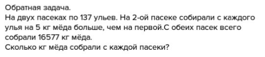 (16577 - 685)÷2 = 15892÷2 = 7946 (кг) - собрали мёда с 1 пасеки.