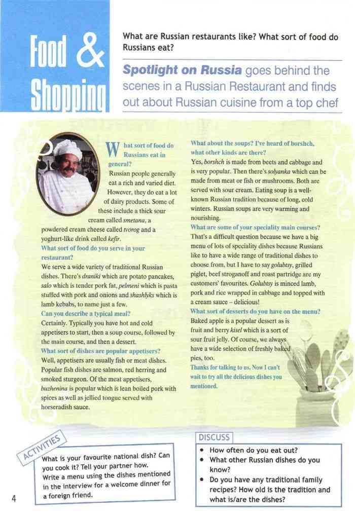 В целом у русских богатый и разнообразный рацион. Однако они едят много молочных продуктов. Среди них густой кислый крем под названием сметана,крупитчатый сливочный сыр -- творог и йогуртоподобный напиток -- кефир.