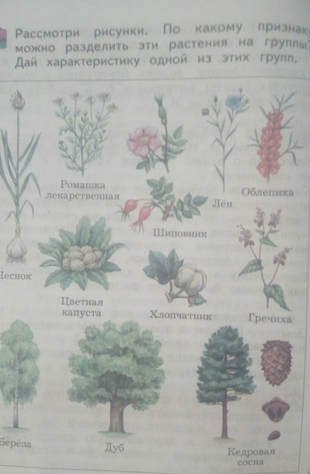 рассмотри рисунки.По какому признаку можно разделить эти растения на группы? Чеснок,ромашка лекарственная,шиповник,лен,облепиха,цветная капуста,хлопчатник,гречиха,береза,дуб,кедровая сосна.