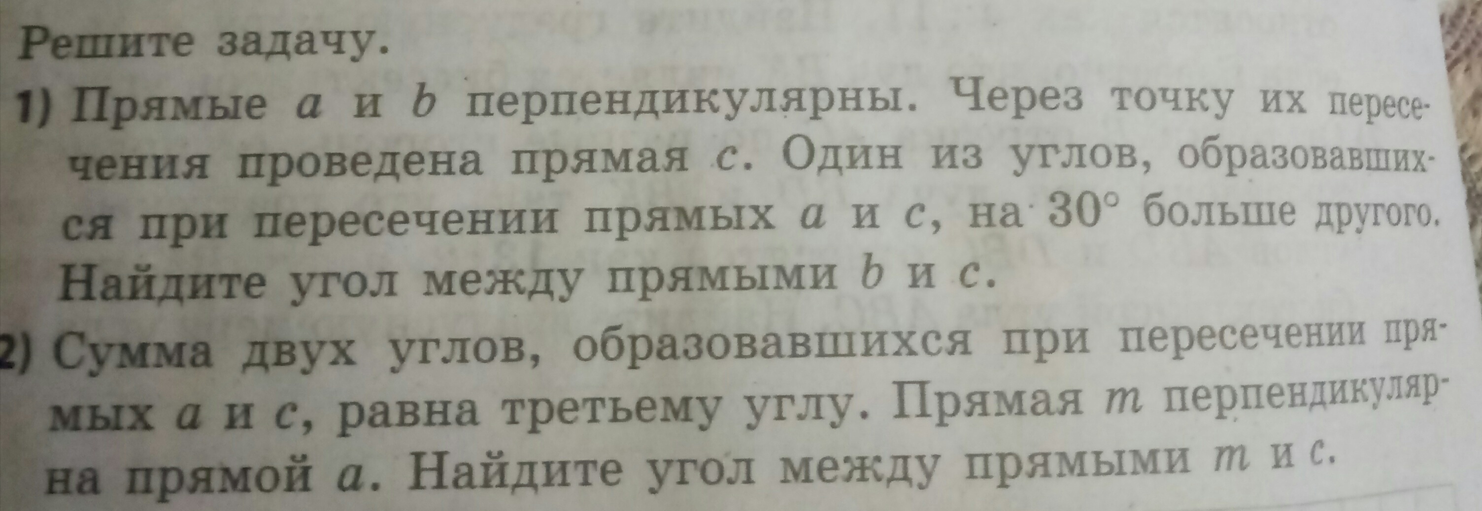 1) Прямая а при пересечении с прямой с образует 2 смежных угла. Так как один из них по условию больше другого на 30 градусов, то углы соответственно будут 180:2+15=105 градусов и 180:2-15=75 градусов. Прямые а и b перпендикулярны, значит угол между ними 90 градусов. Угол между прямой с и b будет равен 90-75=15 градусов