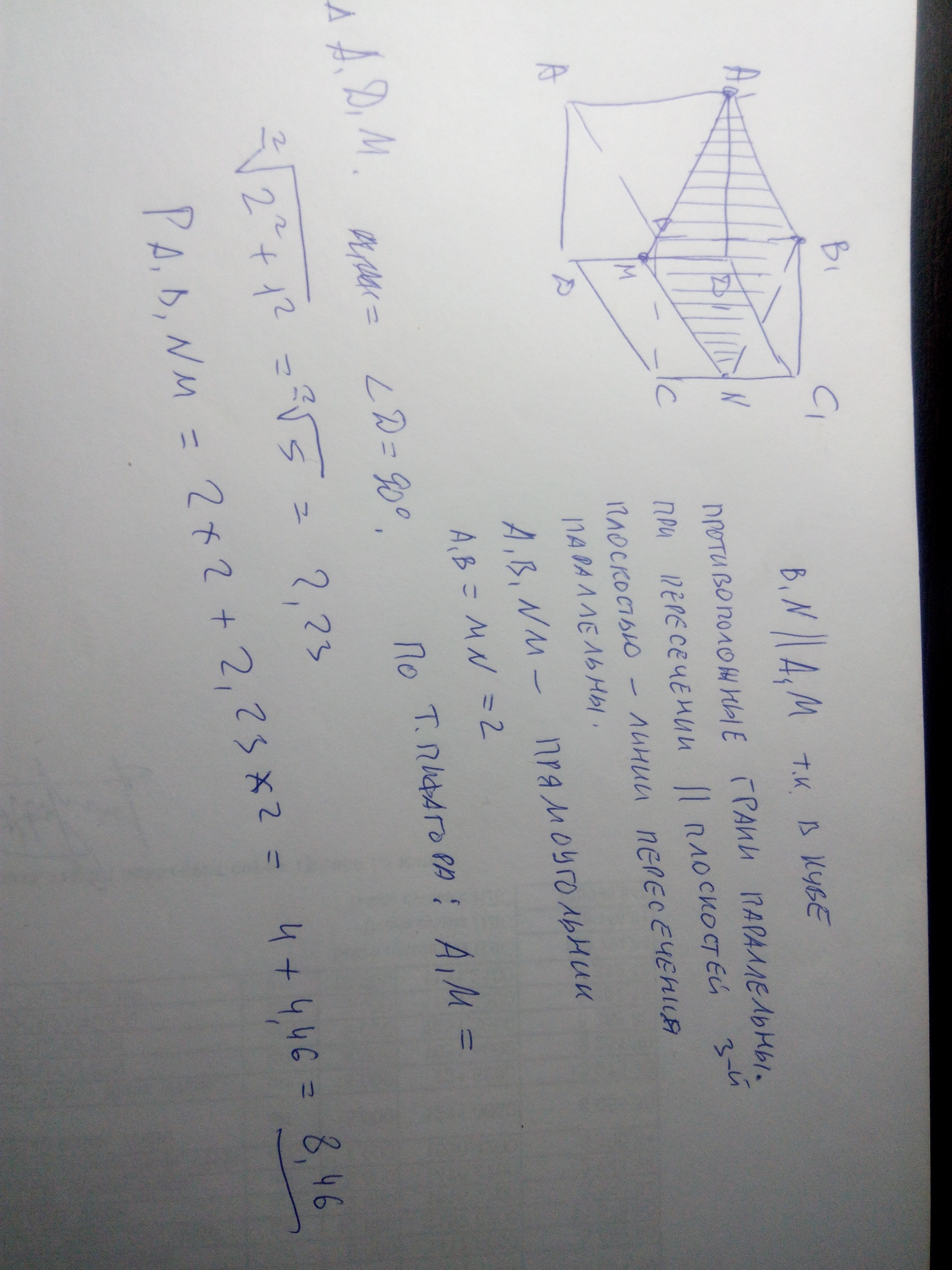 ABCDA1B1C1D1 -куб, ребро которого 2 см. постройте сечение куба плоскостью, проходящей через точки a1, в1 и m, где m- середина ребра дд1. вычислите периметр сечения. пожалуйста, сделайте решение с рисунком