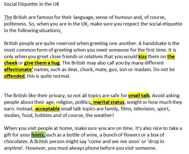 1 kiss them on the cheek – when your lips touch their face 2 give them a hug – put your hands around them 3 affectionate names – names that friends and relatives use for each other 4 don’t be offended – don’t get angry OR don’t take it seriously 4 small talk – conversation that is not serious 5 marital status – whether they are married or not 6 acceptable – nice and possible 7 hosts – the people that you are visiting