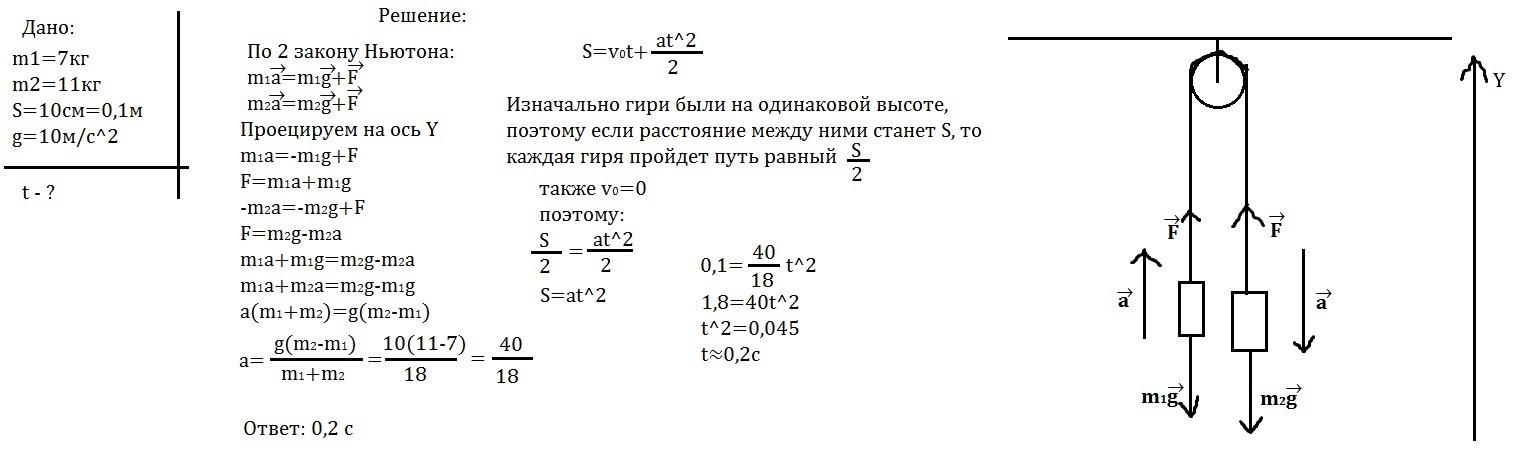 Две гири массами m1=7 кг и m2=11кг висят на концах нити,которая перекинута через блок.Гири вначале находятся на одной высоте.Через какое время после начала движения более легкая гиря окажется на 10 см выше тяжелой?