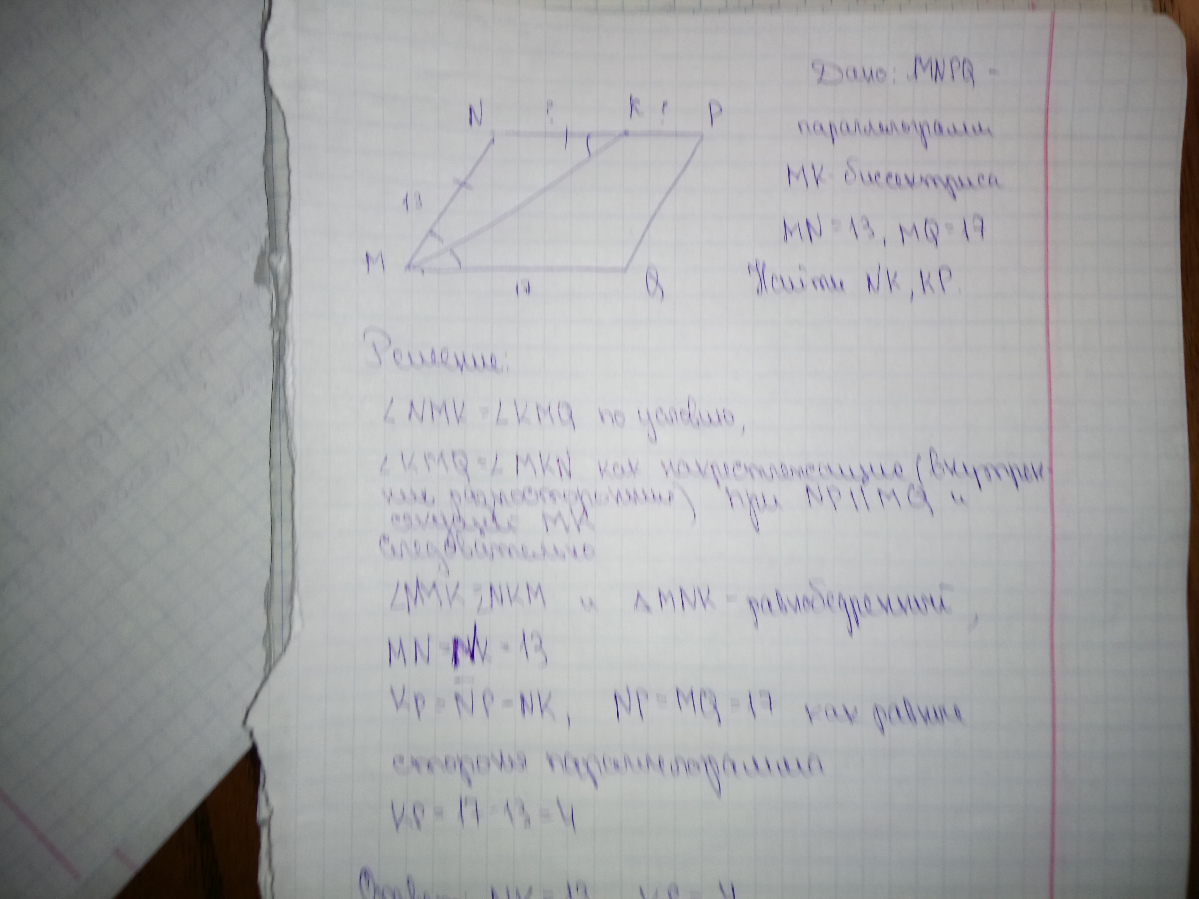 Помогите пожалуйста с задачей:в параллелограмме MNPQ проведена биссектриса угла M,которая пересекает сторонуNP в точке K.Найдите отрезки NK и KP .Если MN=13 MQ=17