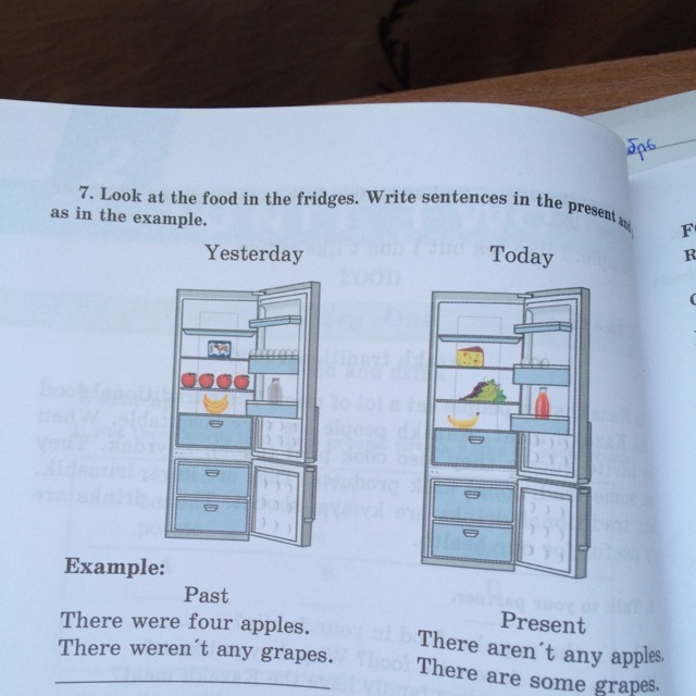Yesterday was 4 apples and a lot of eggs, today it is not, but there was cheese and grapes (Вчера было 4 яблока и много яиц, сегодня этого нет, но появился сыр и виноград)