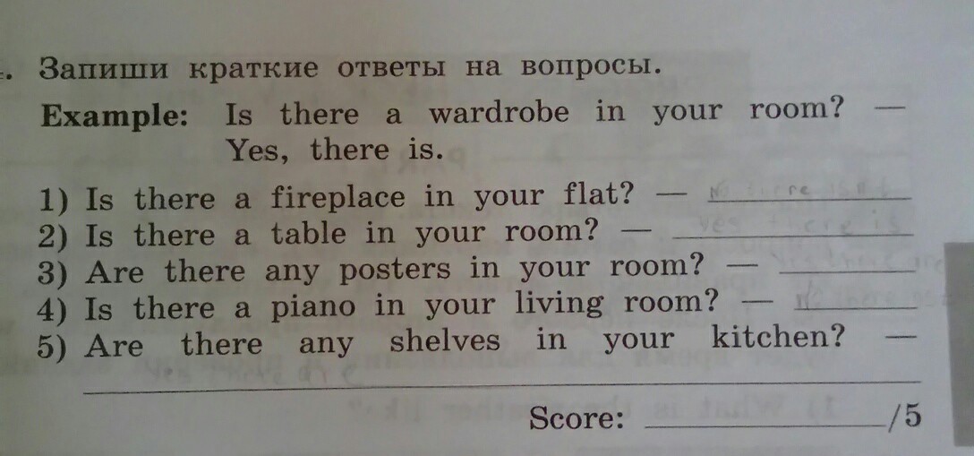 1) Есть ли камин в вашей квартире? 2) Есть ли в вашей комнате стол? 3) Есть ли в вашей комнате плакаты? 4) Есть ли в вашей гостиной рояль? 5) Есть ли в вашей кухне полки?