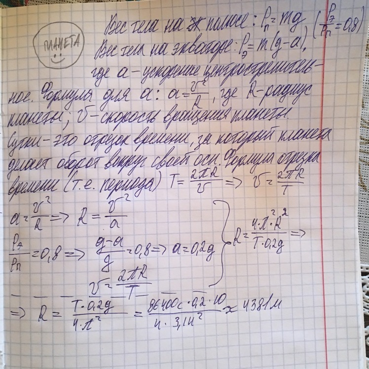 определите радиус планеты у которой на экваторе вес тела на 20% меньше ,чем на полюсе .Масса планеты равна 6×10 ^24 кг. пролжитеьнсть суток 24 часа