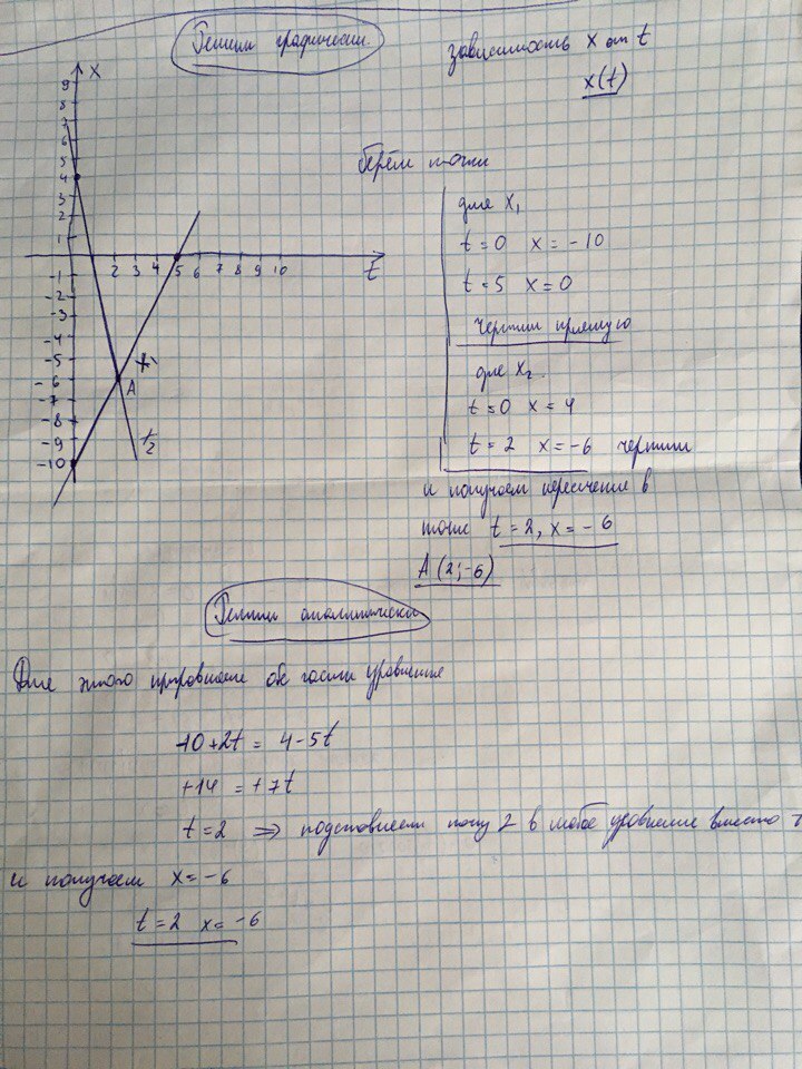 вдоль оси 0x движутся два тела первое Согласно уравнению x1 =-10+2t.а второе согласно уравнению x2=4-5t. В какой момент в какой точке они встретяться? Задчу решить АНАЛЕТИЧЕСКИ и ГРАФИЧЕСКИМ.