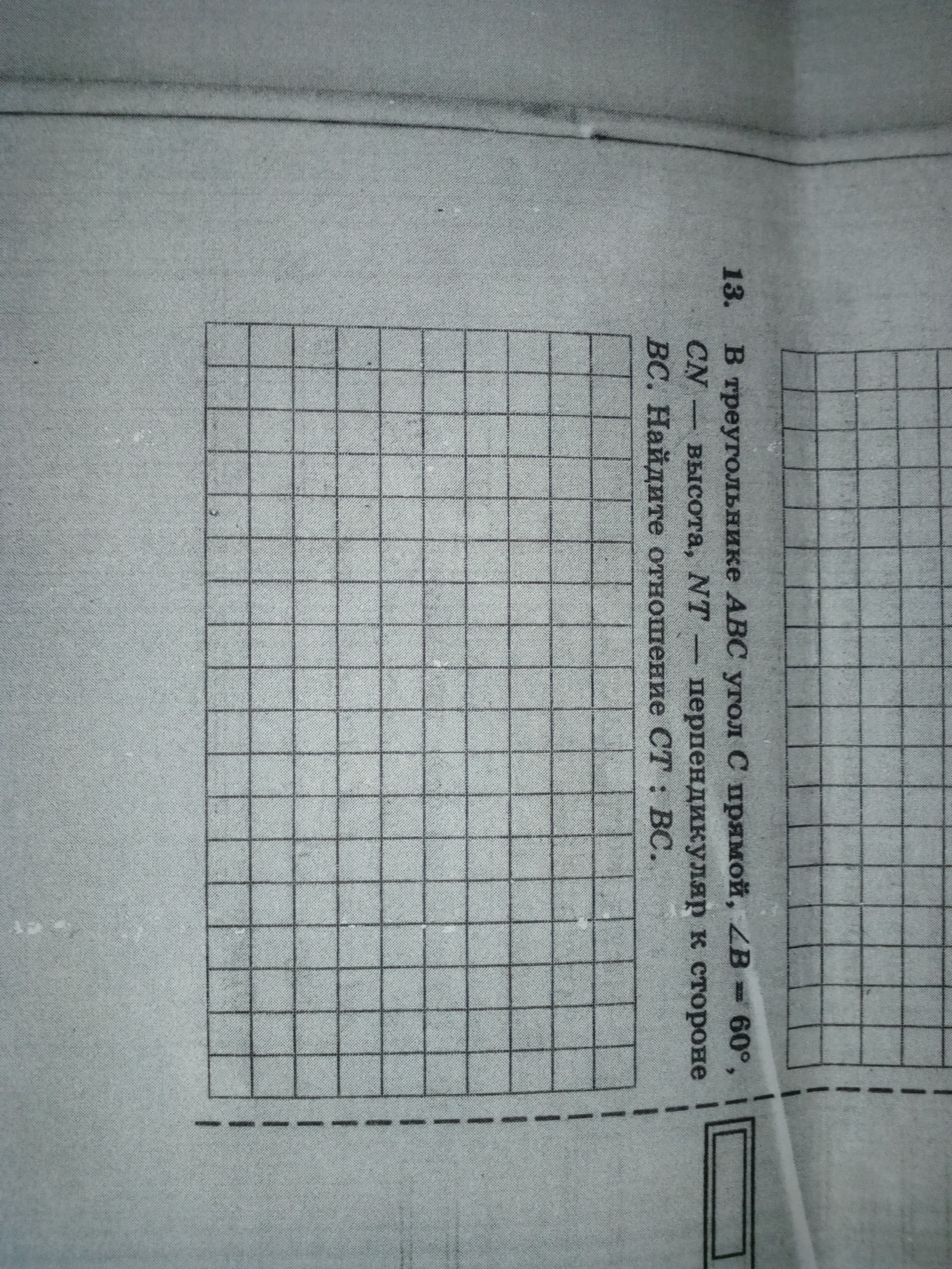 В треугольнике АВС угол С прямой, угол В=60°, CN- высота, NC- перпендикуляр к стороне ВС. Найдете отношение СТ:ВС