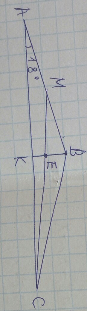 В треугольнике ABC угол A=18°, биссектрисы CM и BK пересекаются в точке E. Найдите градусную меру угла