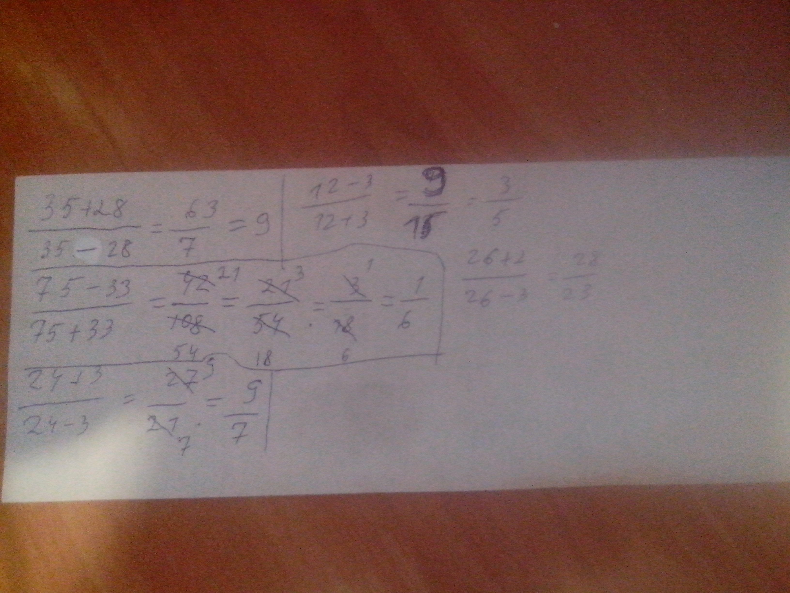 Сократите дробь : 35+28/35-28 , 75-33/75+33 , 24+3/24-3 , 15+6/15-6 , 12-3/12+3 , 26+2/26-3. 30 баллов дам