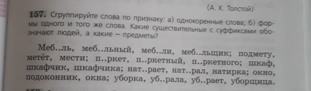 сгруппируйте слова по признаку а однокоренные слова и формы одного и того же слова какие существительные с суффиксами обозначают людей какие предметы