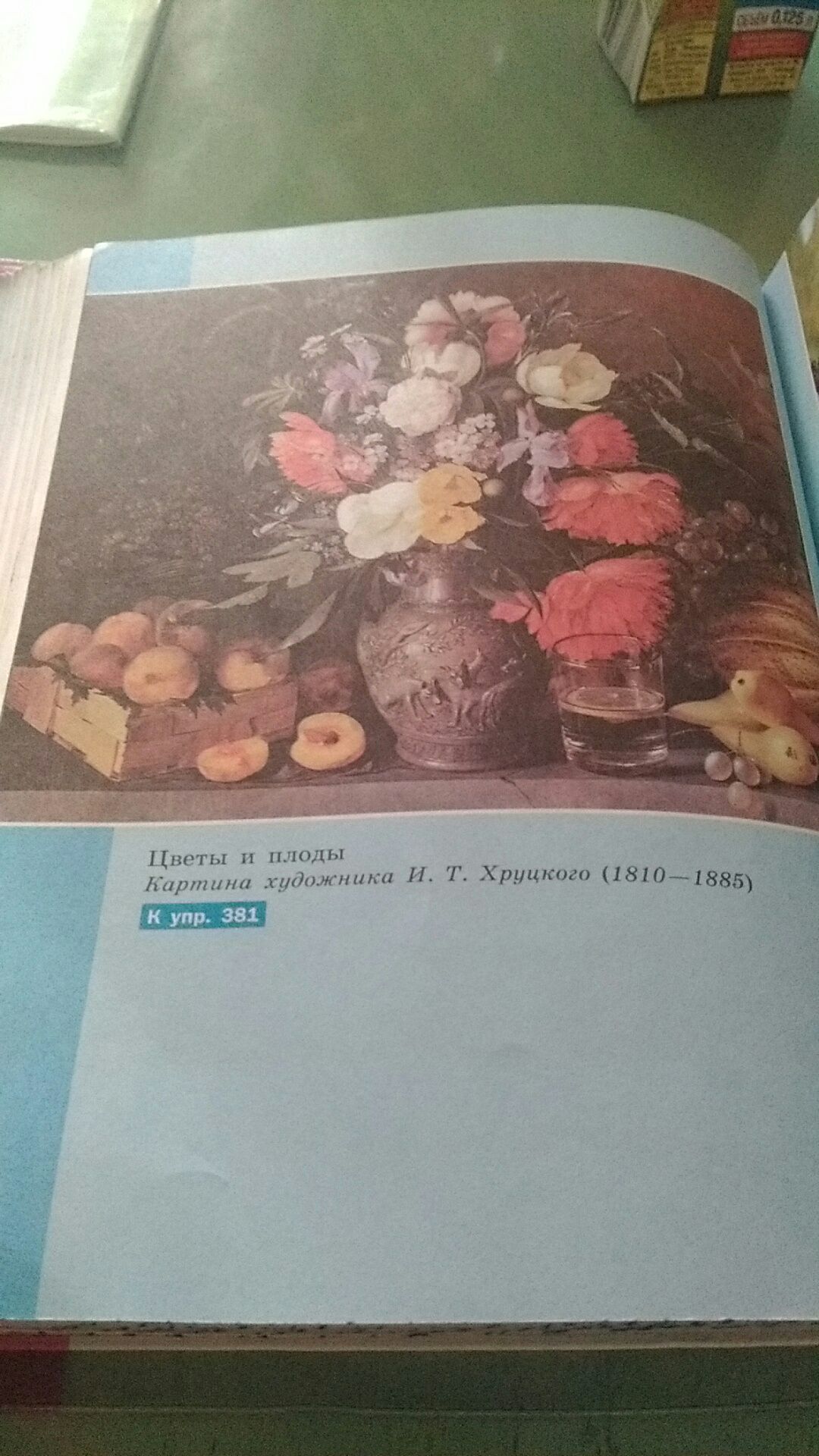 на картине изображена по центру расписаноя глиной ваза, в ней цветы красные,белые, один нежно розовый,жёлтые и слегка пурпурные.С права тыква,груши,виноград.С лево в плетёной корзинке нежные персики один разломанный пополам без косточки лежит с переди.