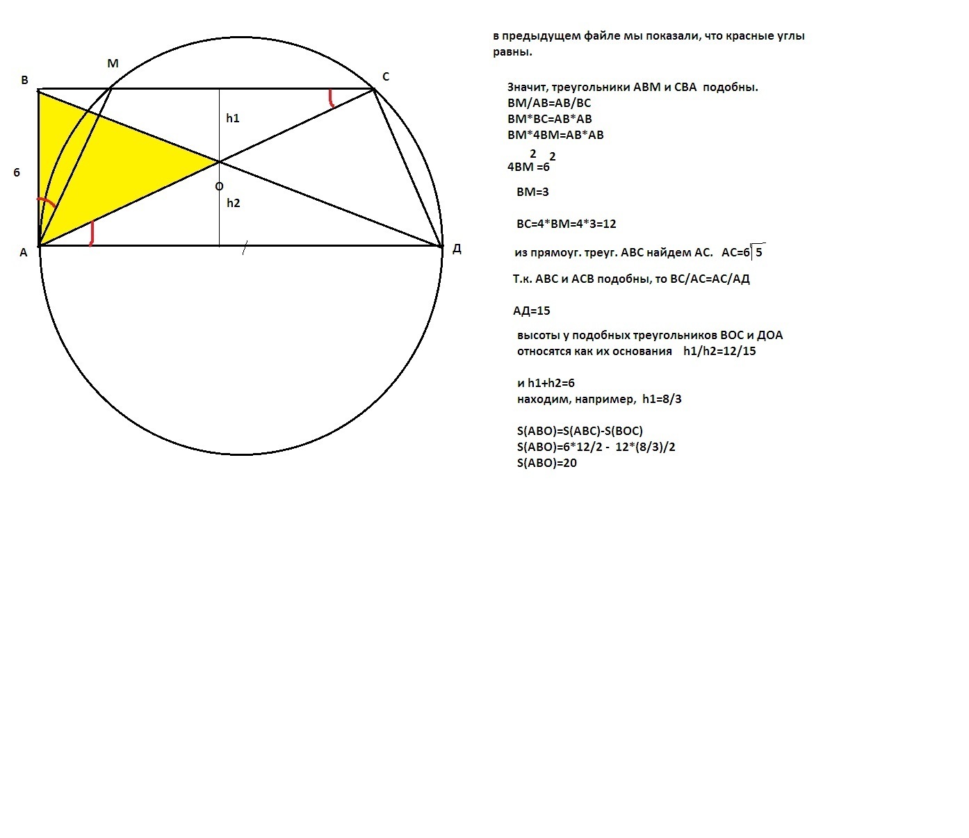 б) Диагонали трапеции ABCD пересекаются в точке O. Найдите площадь треугольника AOB, если AB=6, а BC=4BM.