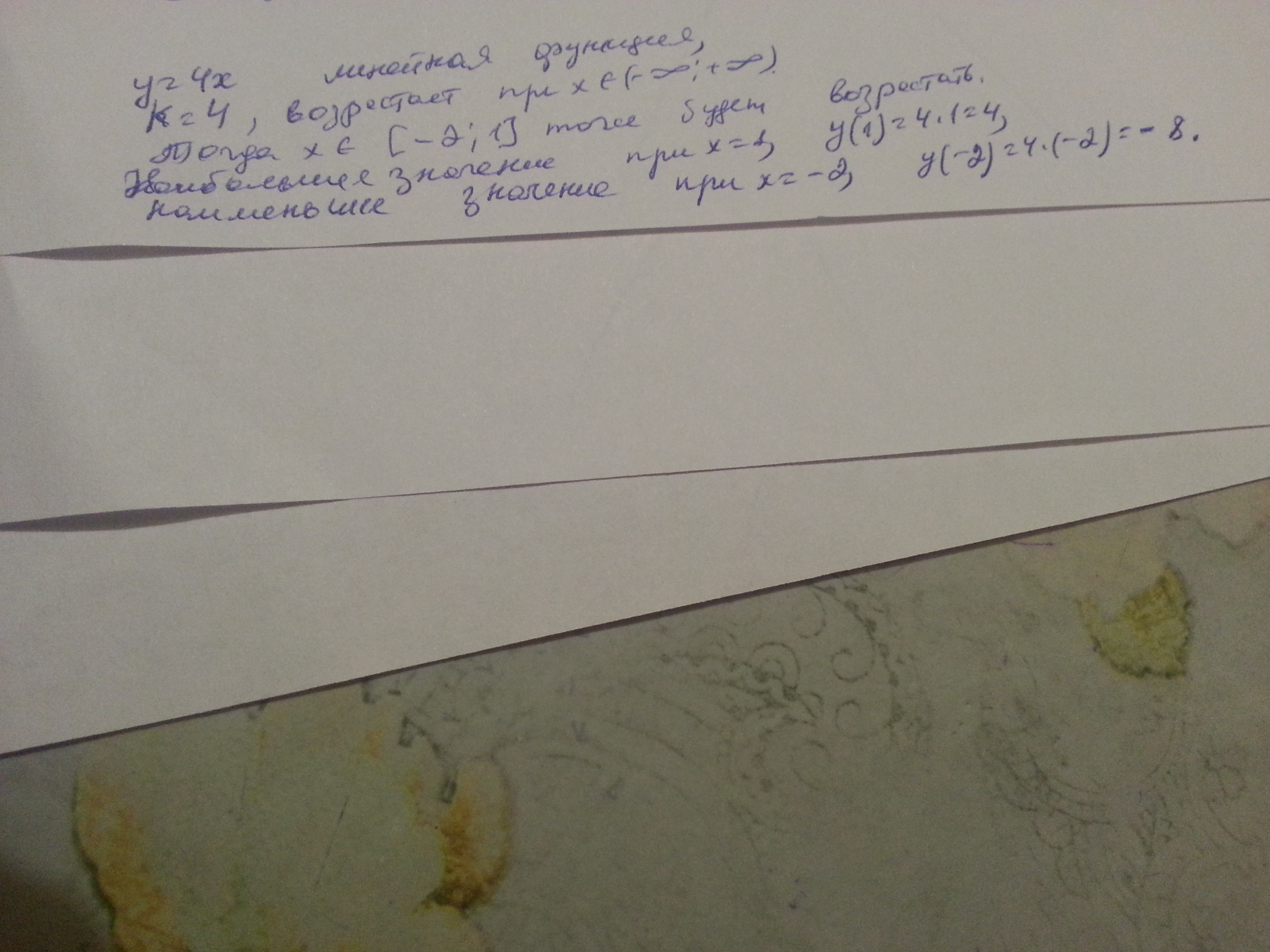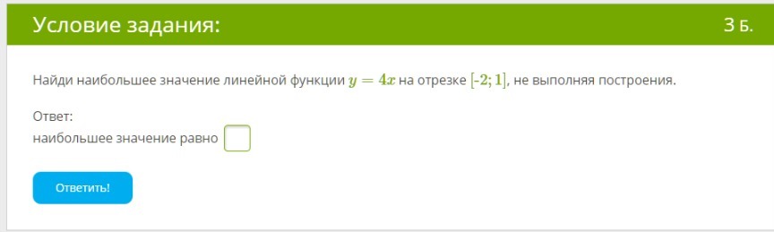 Найди наибольшее значение линейной функции y=4x на отрезке [-2;1], не выполняя построения.