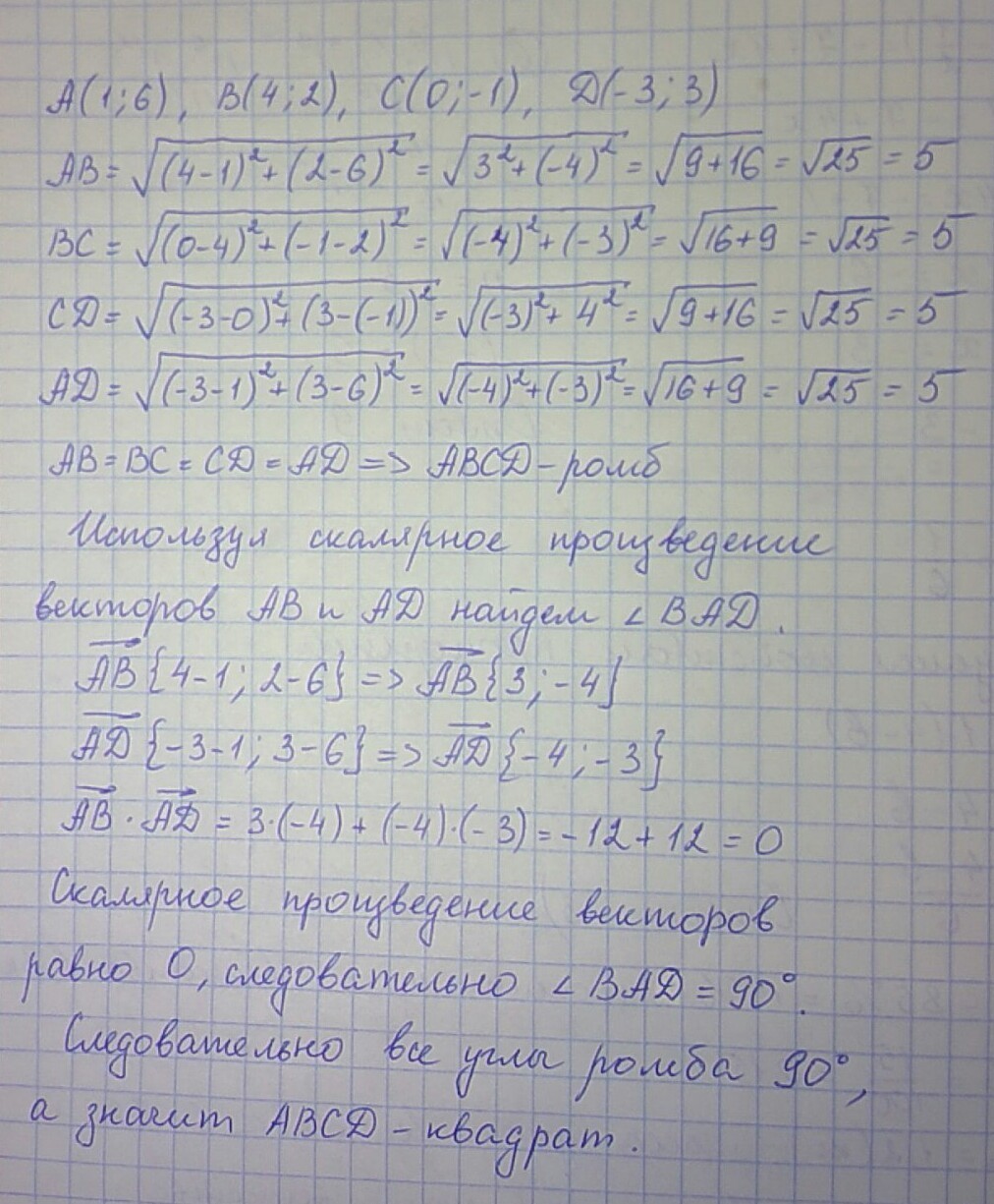 Докажите, что четырехугольник ABCD с вершинами в точках А(1; 6), В(4; 2), С(0; -1), D(-3; 3) является ромбом. Будет ли ромб ABCD квадратом?