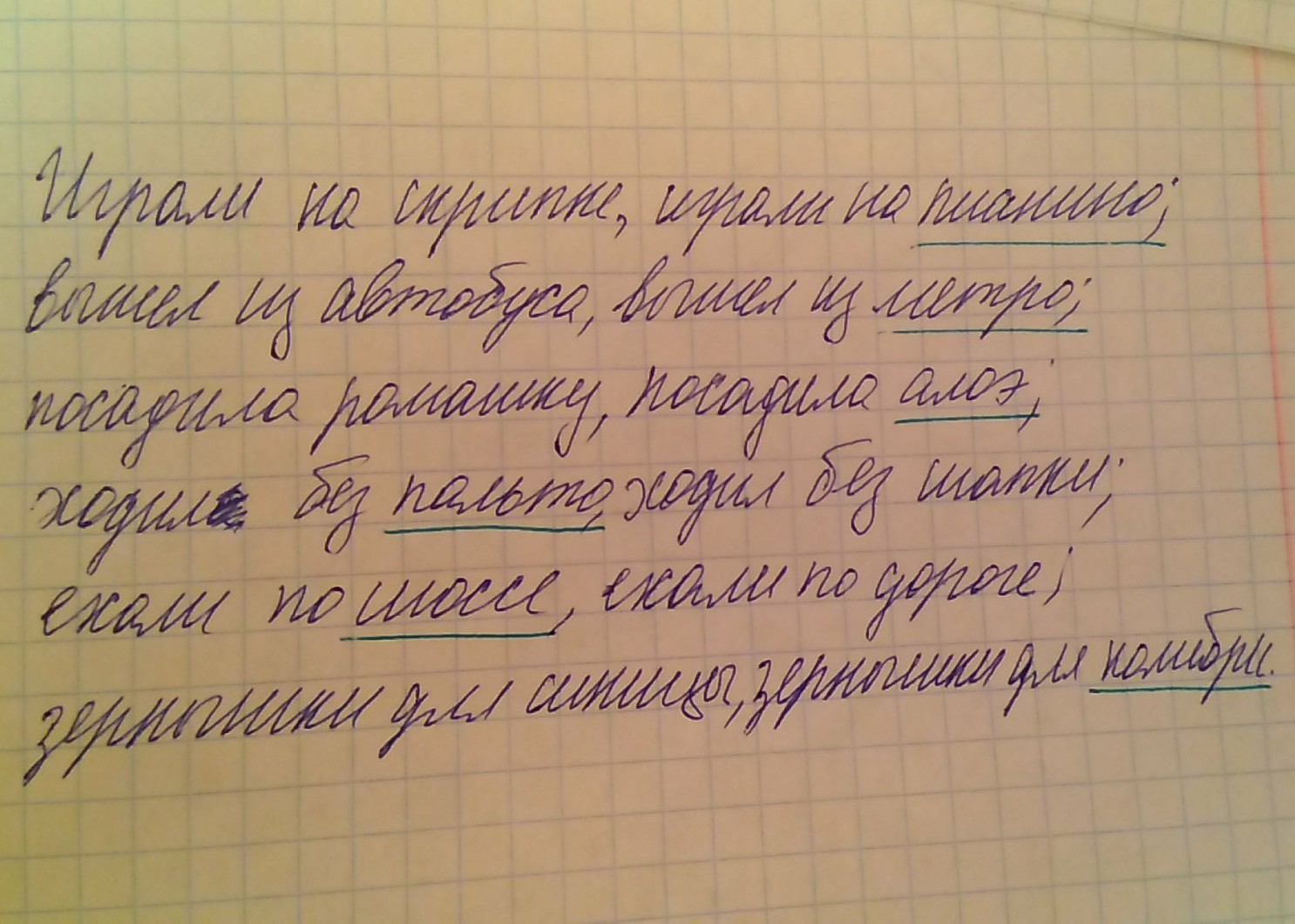 Играли на скрипке, фортепиано. Вышел из автобуса, метро. Посадила ромашки,алоэ. Ходил без пальто, шапки. Ехали по шоссе,дороге. Зернышки для синиц,колибри.