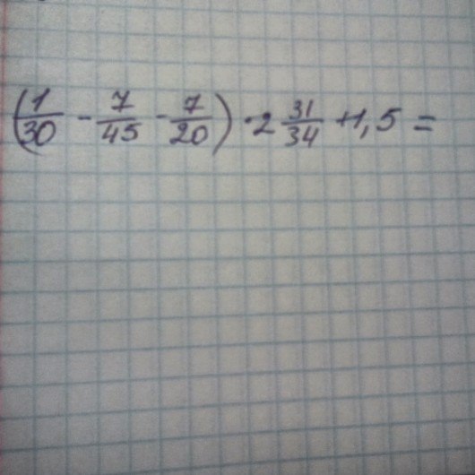 (1/30-7/45-7/20)*2.31/34+1,5= (6/180-28/180-63/180)*2.31/34+1,5= 17/36*2.31/34+1,5= 11/6+1.1/2= 1.5/6+1.3/6= 3. 1/3