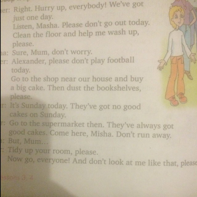 Сходи в магазин рядом с нашим домом и купи большой торт. Затем протри пыль с полок, пожалуйста.