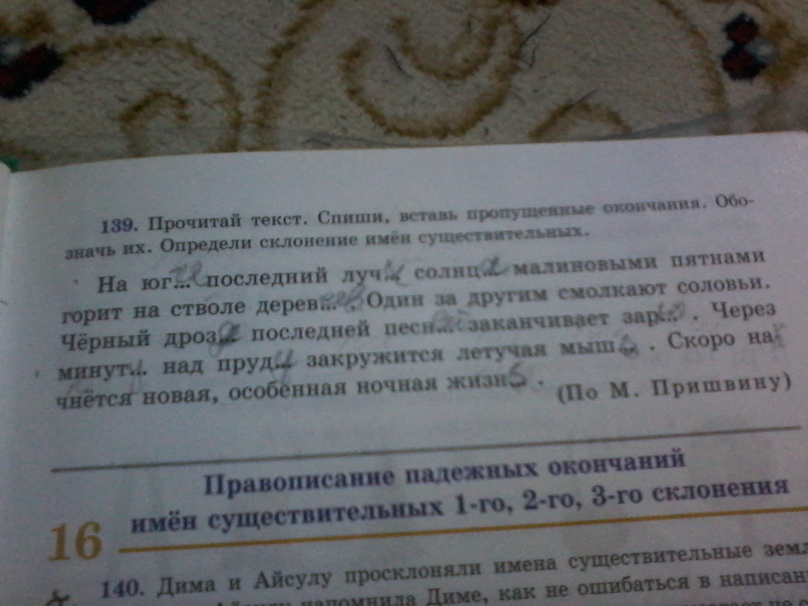 прочитай текс. Спиши, вставь пропущеные окончание. Обозначь их. Определи склонение имён существительных