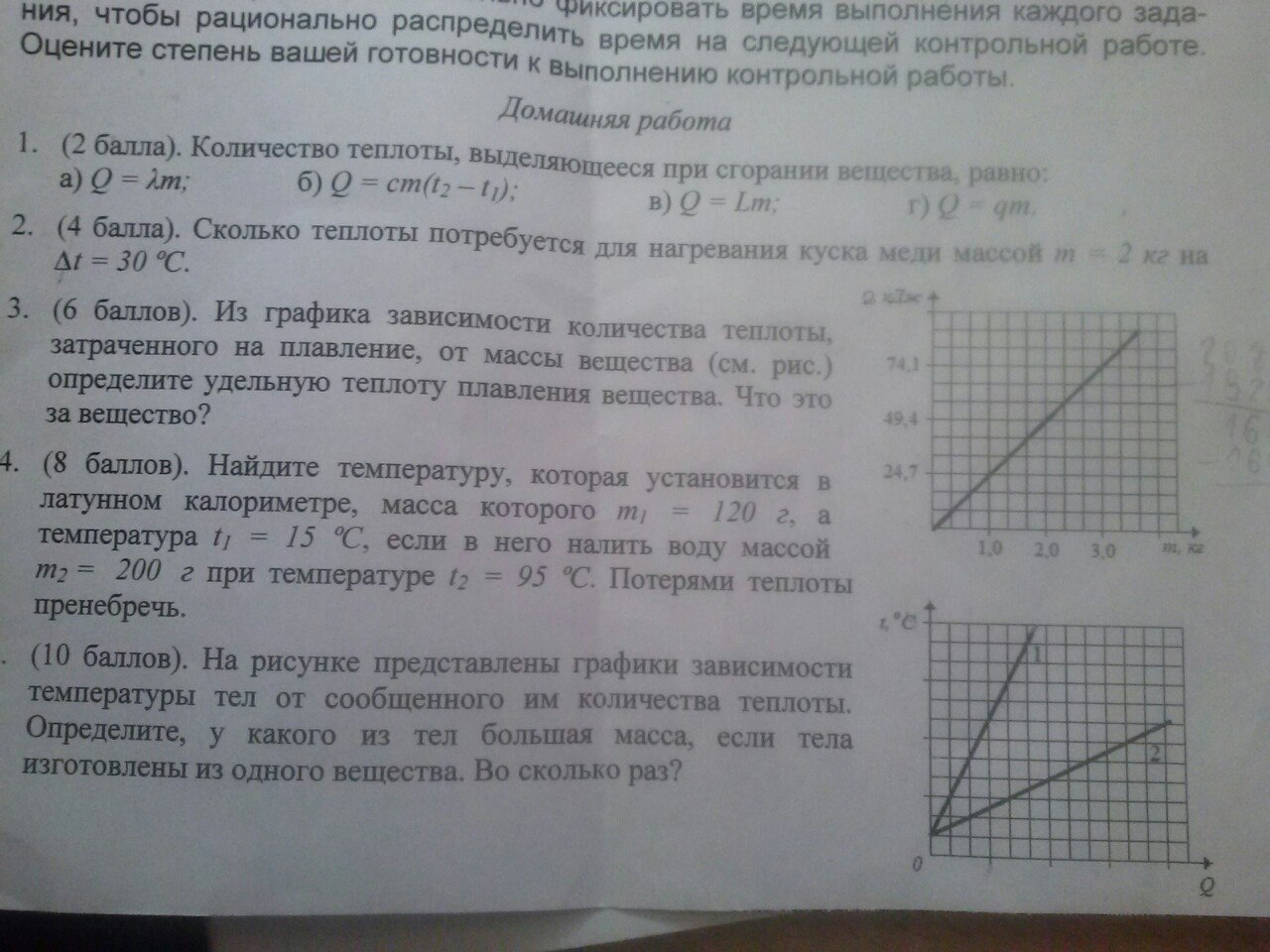 5. Как видно из графика, угол второго графика меньше, чем у первого. Если посчитать клеточки, то выйдет, что угол первого больше в 3 раза, чем угол второго. Т.е масса второго тела больше (т.к температура изменяется меньше) в 3 раза