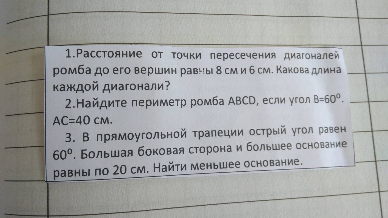 1. Диагонали ромба точкой пересечения делятся пополам, поэтому длинна каждой диагонали равна 8×2=16см и 6×2=12 см