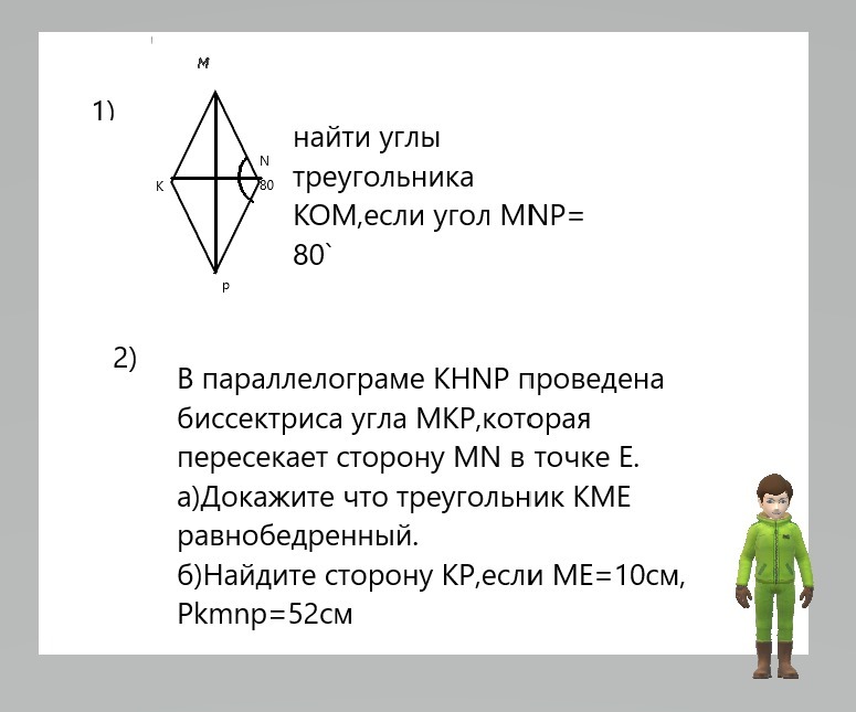 1) кут О зі всіх сторін виходить буде по90 градусів , якщо цілий кут N буде 80 градусів то кут К також буде 80 градусів , якщо кут N поділити на два буде 40 . Отже якщо кут К поділити на два буде також по 40 градусів , в нас відомо вже два кути 90 і 40 градусів . 90+40=130. 180-130=50.