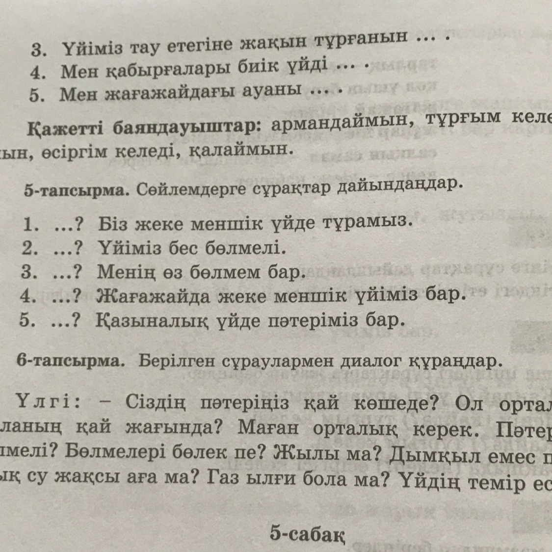 Кандай уйде турасыздар? Уйде канша болме бар? Оз болмен барма? Тагы кайда уйлерініз бар? Патерініз барма?