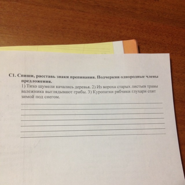 Тихо шумели, качались деревья. (Однородные: шумели и качались. Подчёркиваем двумя чертами)