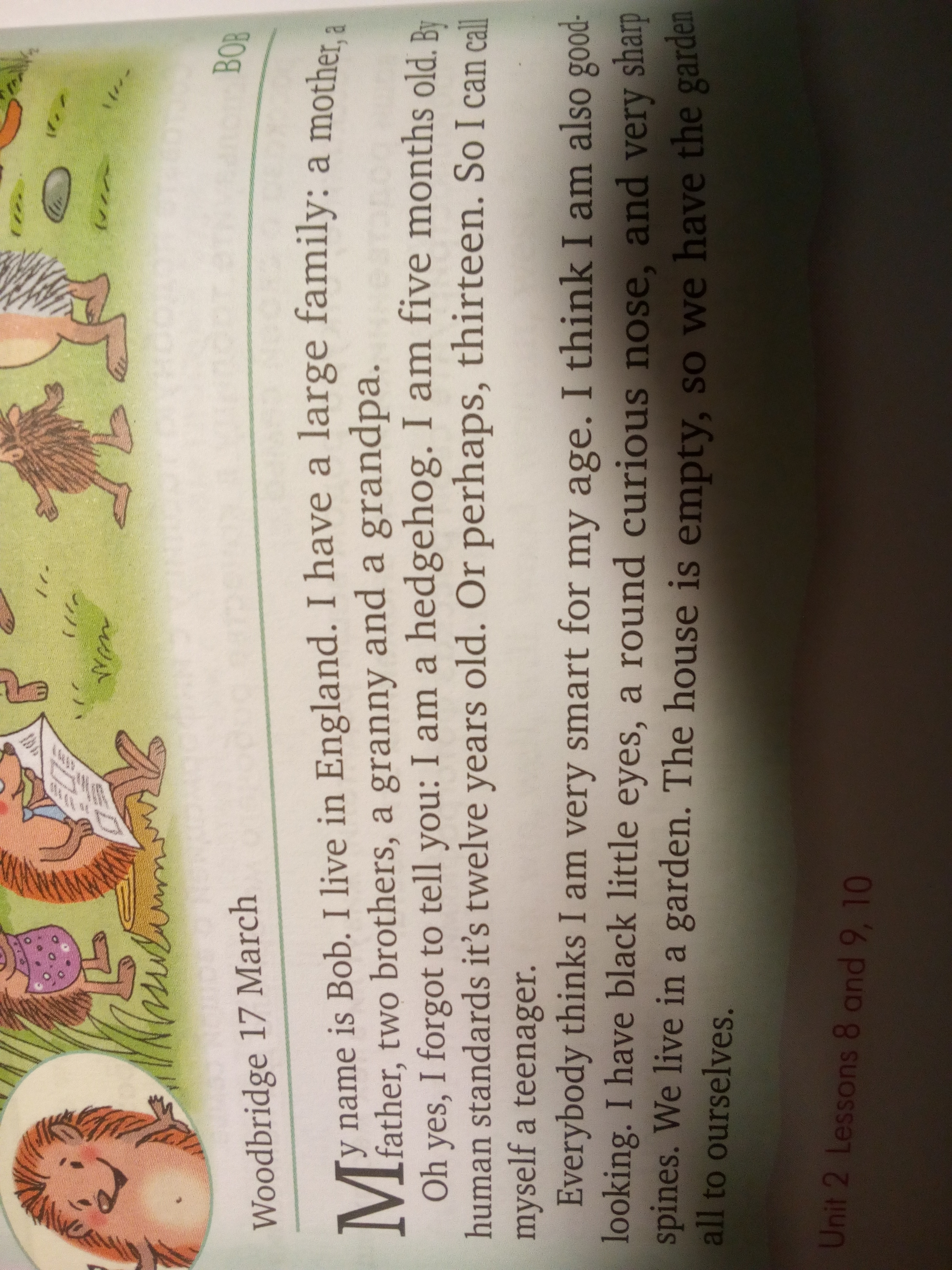 Меня зовут Англия. У меня большая семья: отец, два брата, бабушка и дедушка. о, да, забыл сказать вам: я еж. Мне пять месяцев. человеческим стандартам двенадцать лет. Или, может быть, тринадцать. Поэтому я могу успокоить себя подросток. Все думают, что я очень умный для своего возраста. Думаю, я тоже смотрю. У меня черные черные глаза, круглый любопытный нос и очень ширистые шипы. Мы живем в саду. Дом пуст, так что мы все вместе с собой имеем уроки 2-го урока 8 и 9