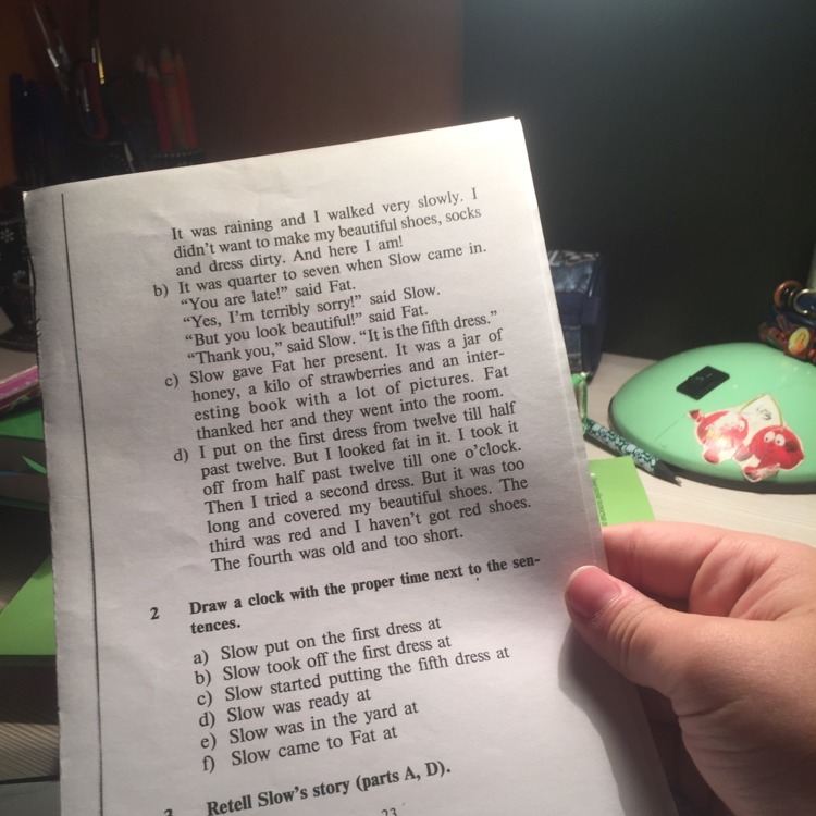 draw a clock with the proper time next to the sentences a) Slow put on the first dress at b) Slow took off the first dress at c) Slow started putting the fifth dress at d) Slow was ready at e) Slow was in the yard at f) Slow came to fat at