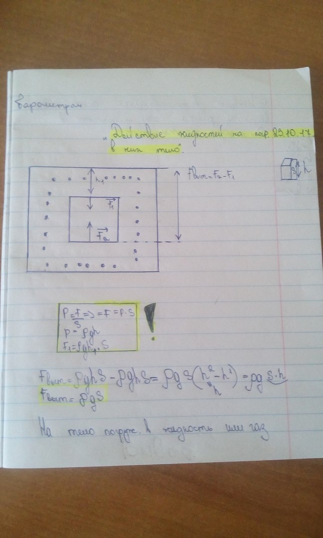 Вывод: на тело погруженное в жидкость или газ действует сила равная весу жидкости (газа) вытесненной этим телом.