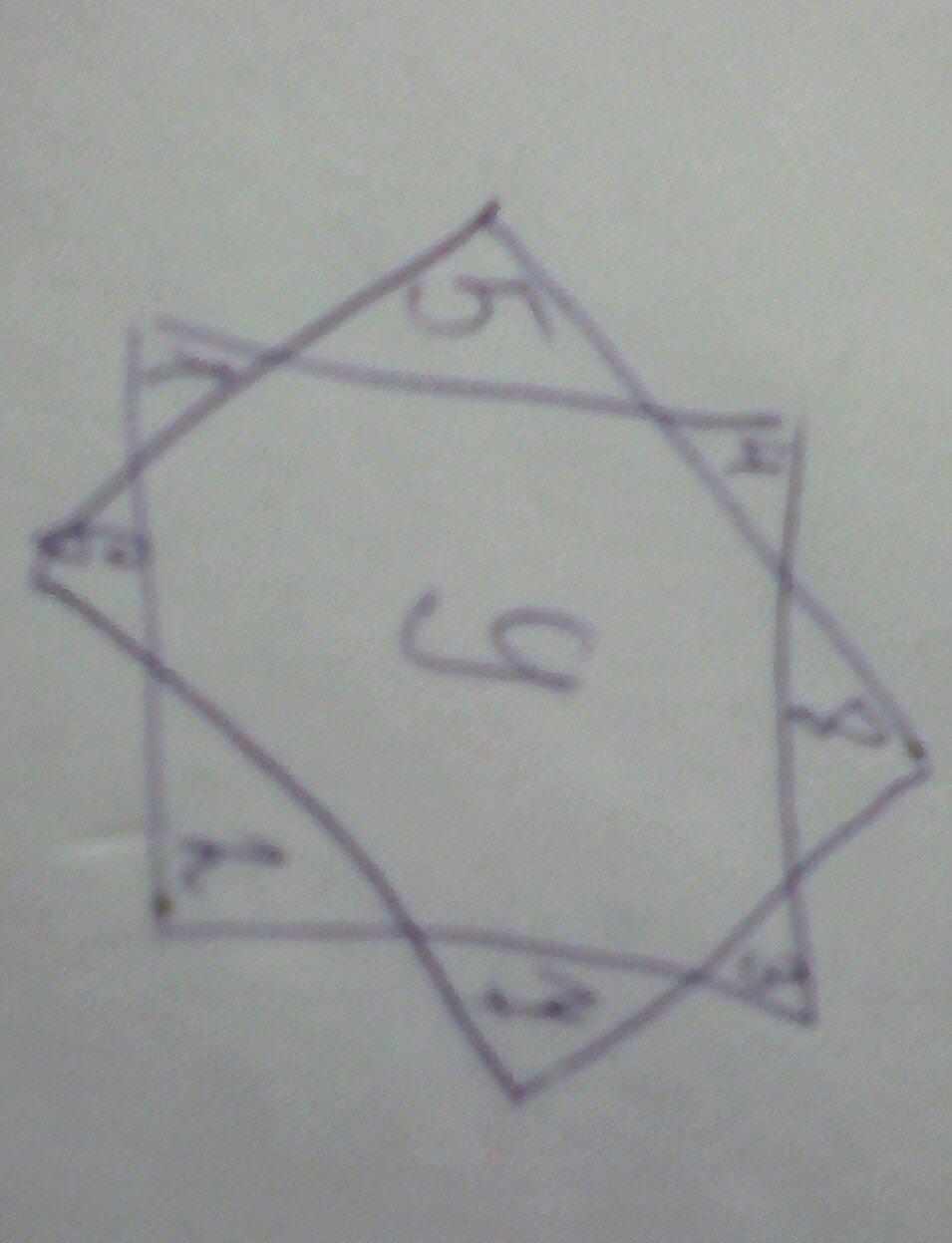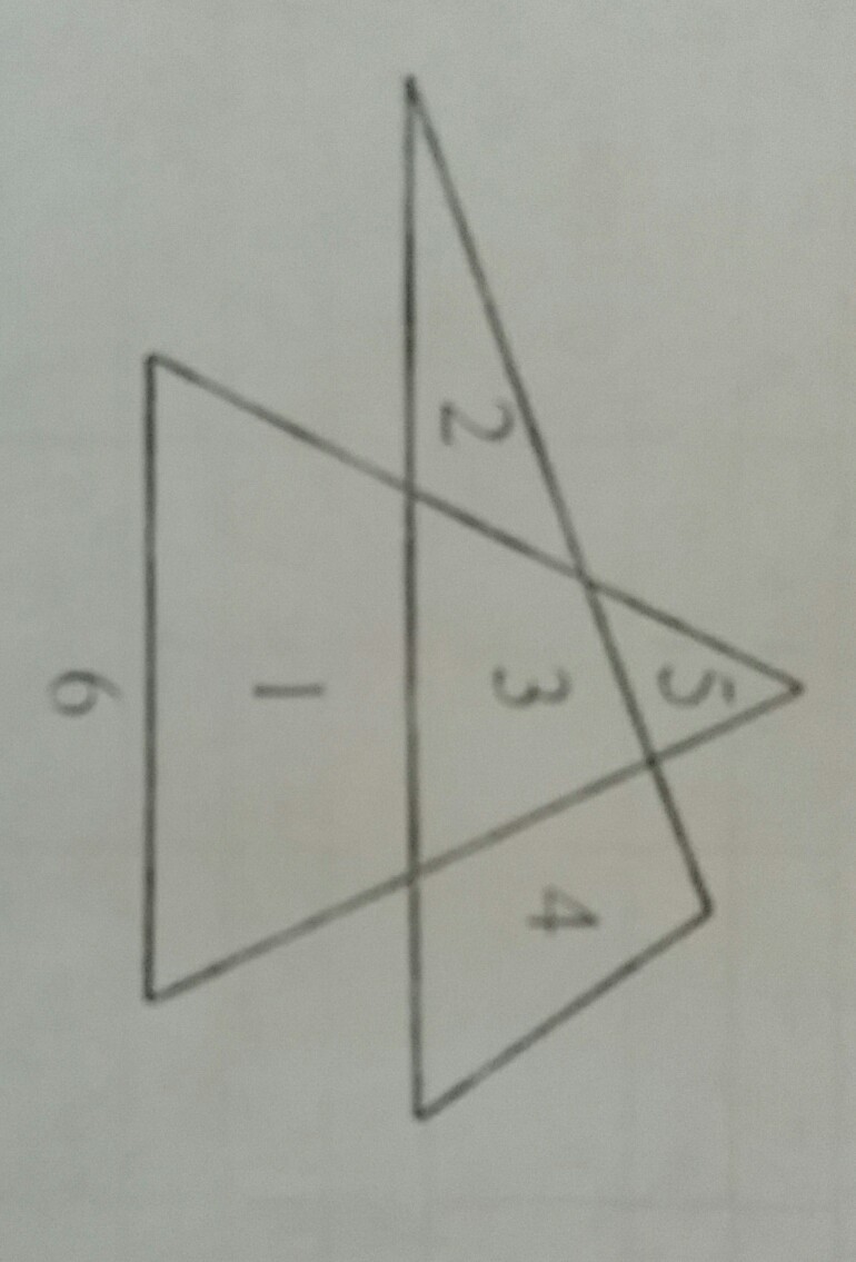 На рисунке два треугольника разлеляют листок бумаги на 6 частей(шестая часть-это то,что останется на листе,если вырезать оба треугольника).Нарисуйте два четырёхугольника,которые разделяют лист бумаги на 9 частей.Пронумеруйте полученные части. <br />
