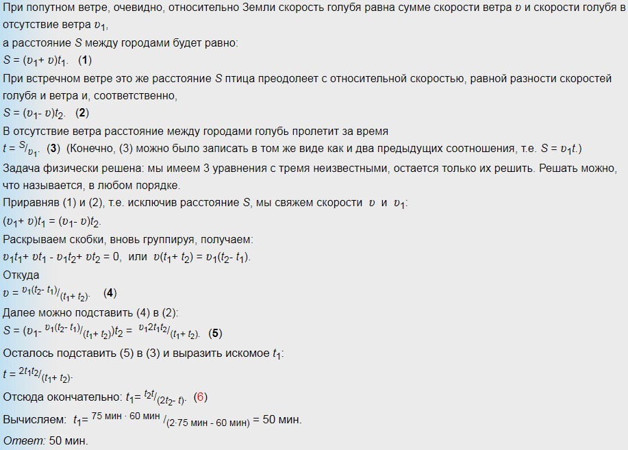 Расстояние между двумя городами почтовый голубь пролетает при отсутствии ветра за t = 60 мин., а при встречном ветре за время t2 = 75 мин.