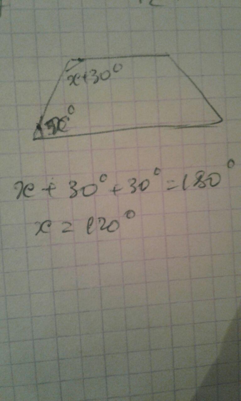Найдите углы равнобедренного трапеции если один из её углов на 30° больше второго. С рисунком, с дано, и с полным ответом. Дам 20 баллов.
