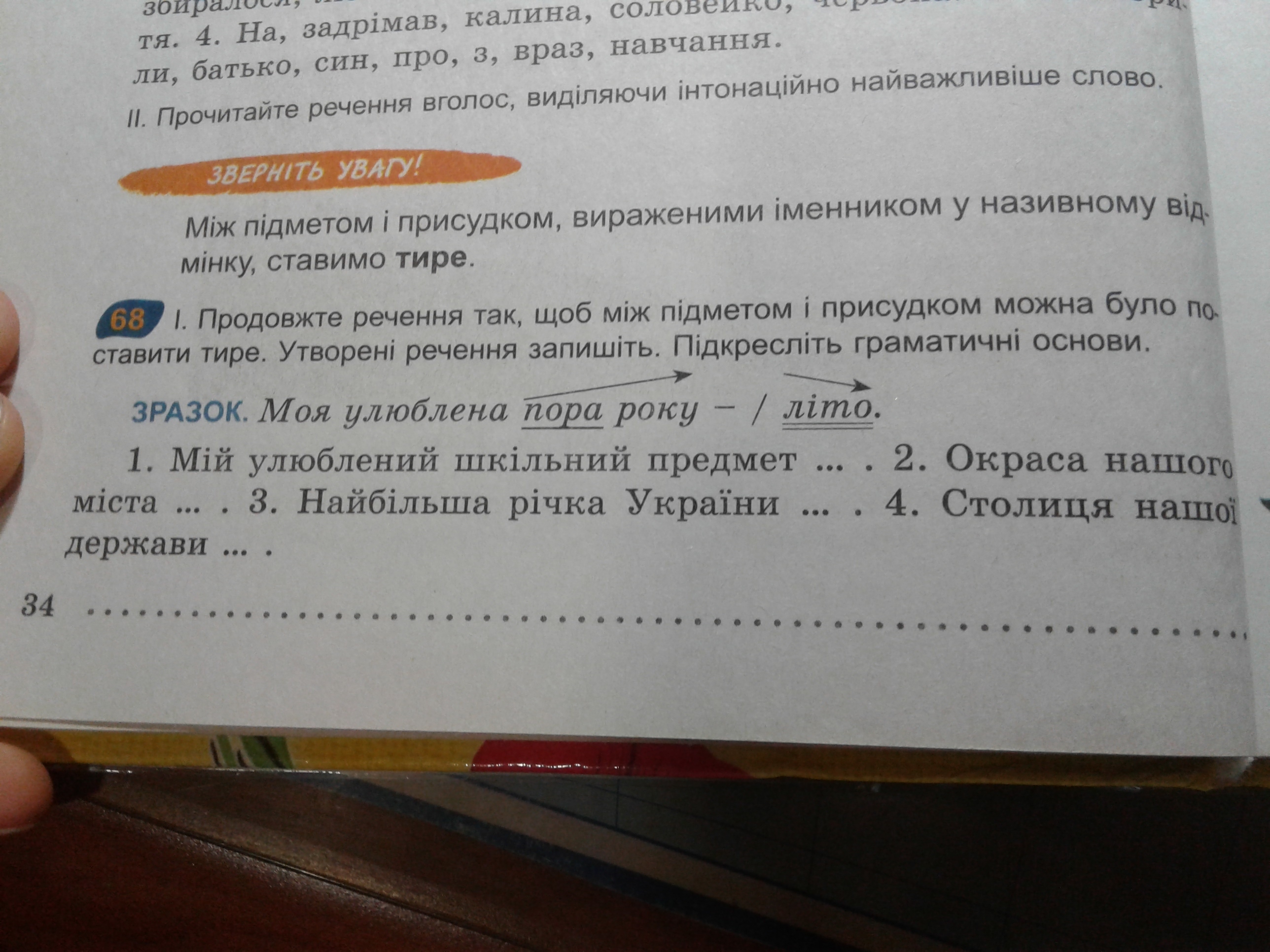 Мій улюблений шкільний предмет - малювання. Окраса нашого міста - велика статуя Тараса Шевченка. Найбільша річка України - Дніпро. Столиця нашої держави - Україна.