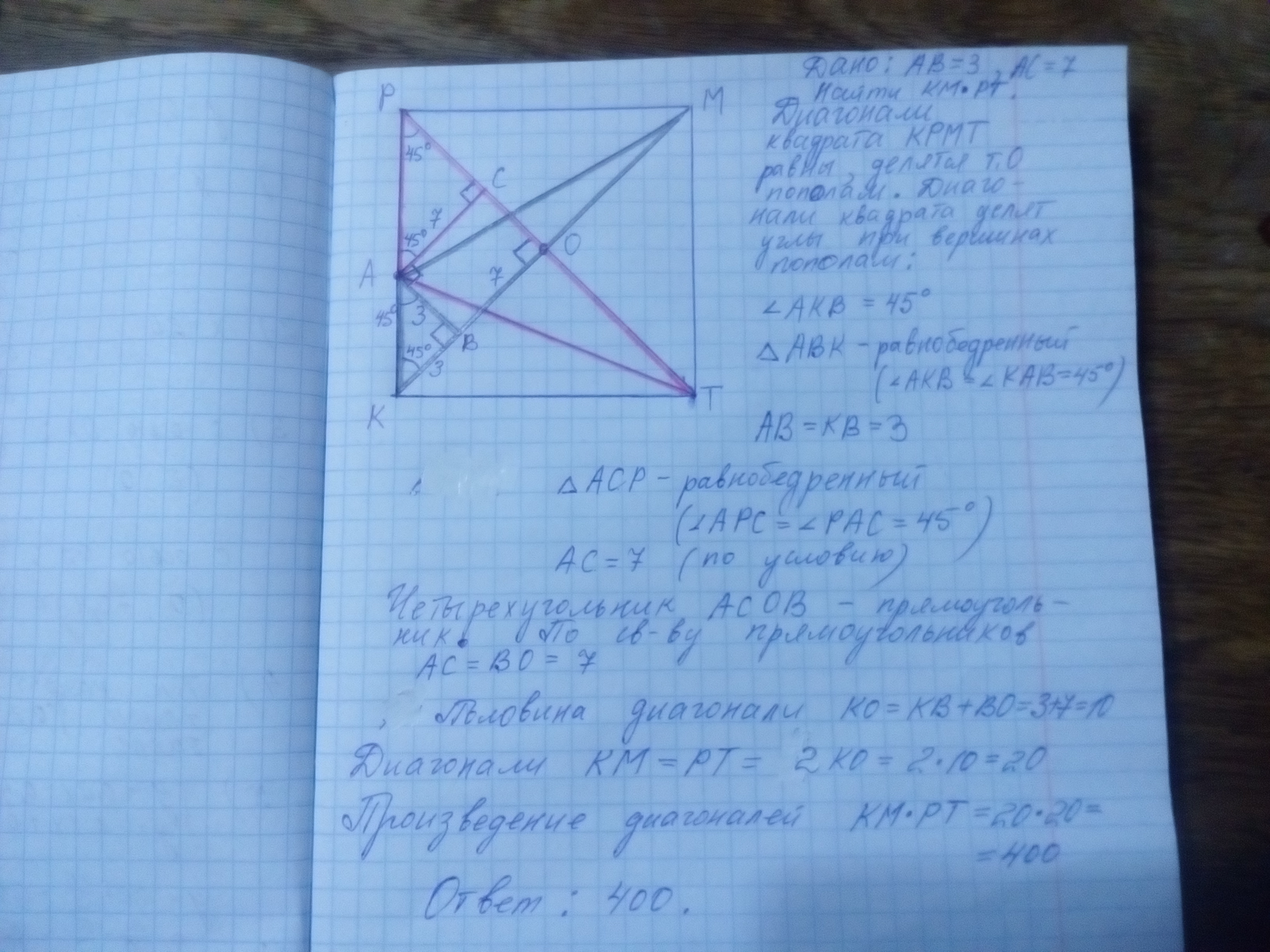 точка A лежит на стороне KP квадрата KPMT. Высоты треугольников AKM и APT проведенные из точки A равны соответственно 3 и 7. Найдите произведение длин диагоналей этого квадрата.