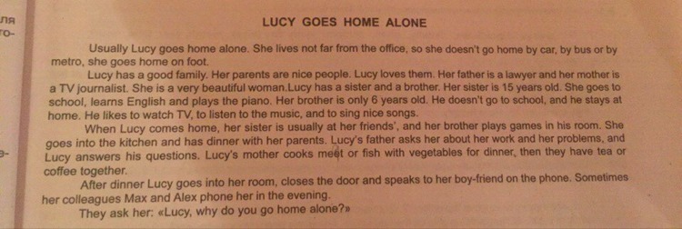 1 Why Marina doesn't do some hard works? Почему Марина не делает ни одного трудного дела? 2 How Marina excuses all this conditions? Как Марина оправдывает все эти состояния? 3 What Marina eats in the dinner? Что она ест на ужин? 4 Who pays for electroenergy while she watches TV? Кто платит за электричество пока она смотрит тв? 5 What Marina does besides counted things? Что Она делает кроме перечисленных вещей?