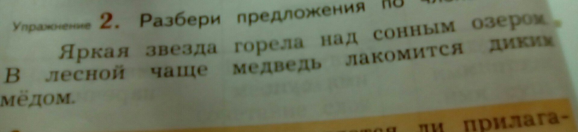 яркая (определение) звезда (подлежащее) горела (сказуемое) над сонным (определение) озером (дополнение)