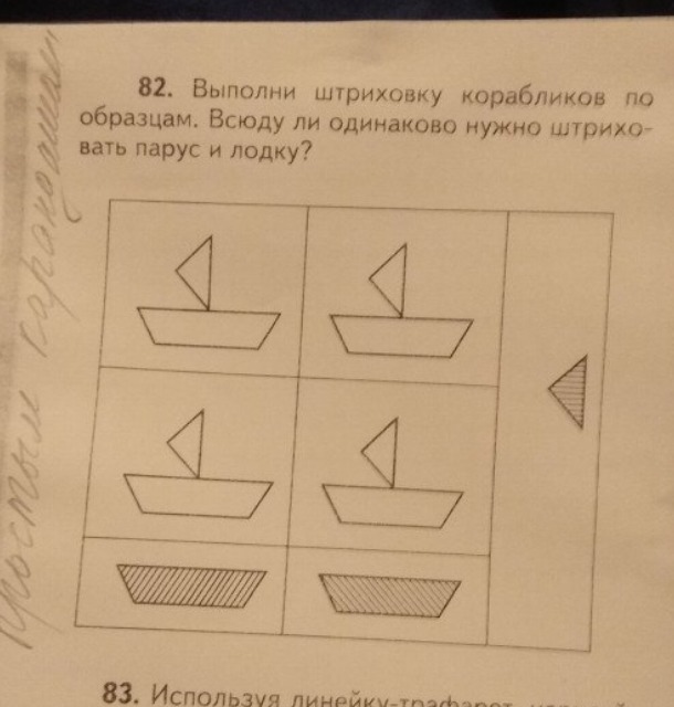 Парус везде штриховать горизонтальными линиями. Лодку - левую колонку наклон в право (как нижняя лодка) , правая колонка - наклон влево (как нижняя лодка под колонкой)
