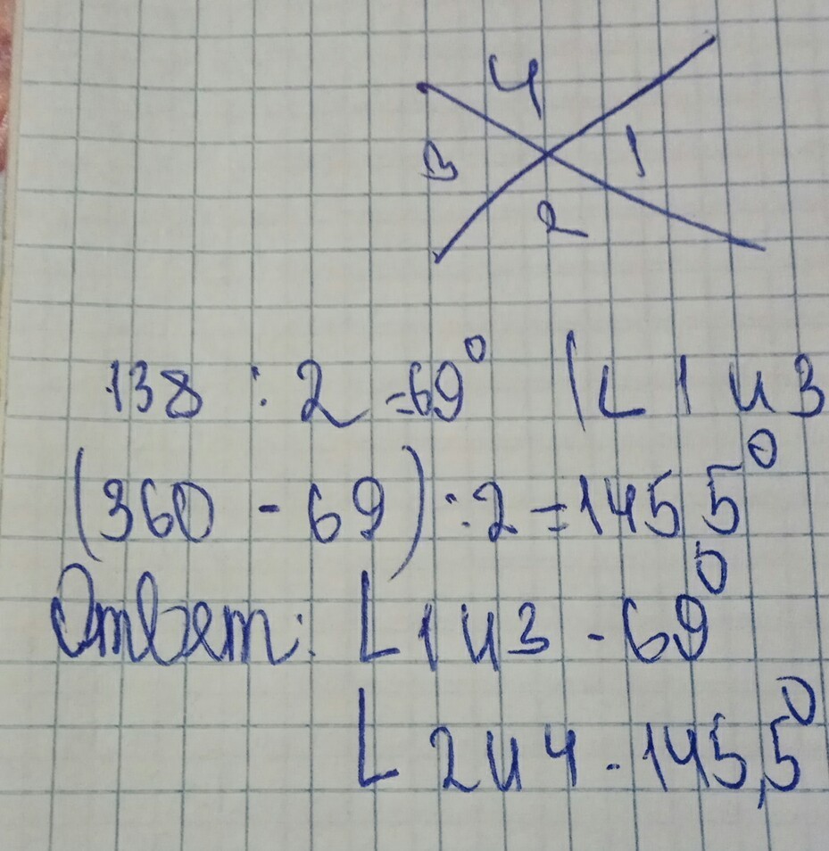 1.Cумма двух углов,образовавшихся при пересечение двух прямых,равна 138 градусов.Найдите все полученные углы.